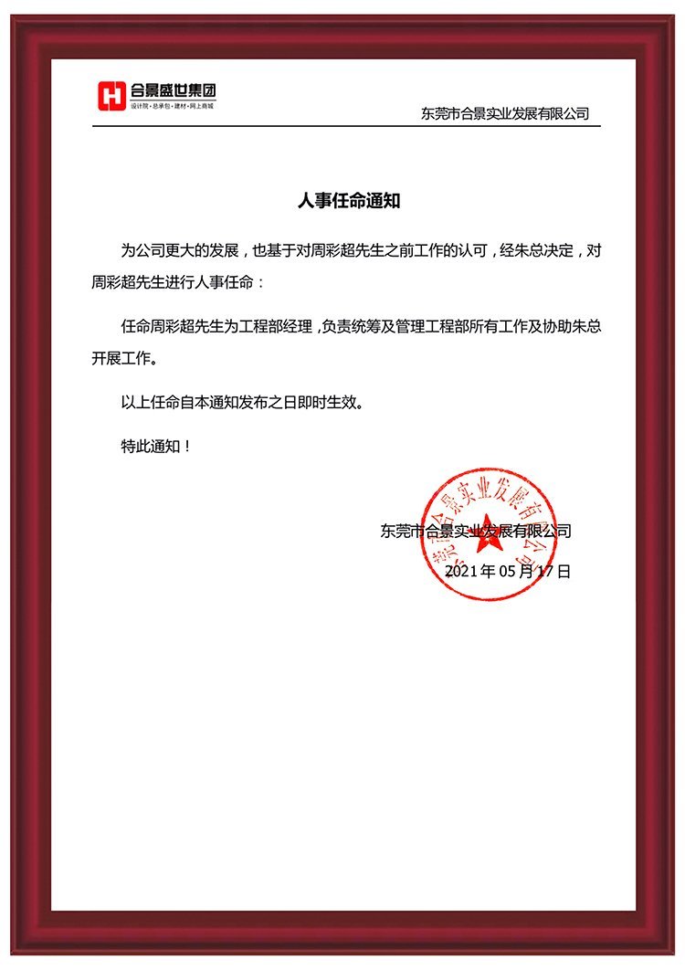 任命周彩超先生為工程部經(jīng)理,負責(zé)統(tǒng)籌及管理工程部所有工作及協(xié)助總經(jīng)理開展其他工作。